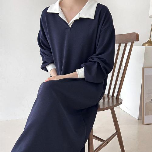[미라클세븐]여성 배색 카라넥 가을 임산부 원피스 스판 롱드레스