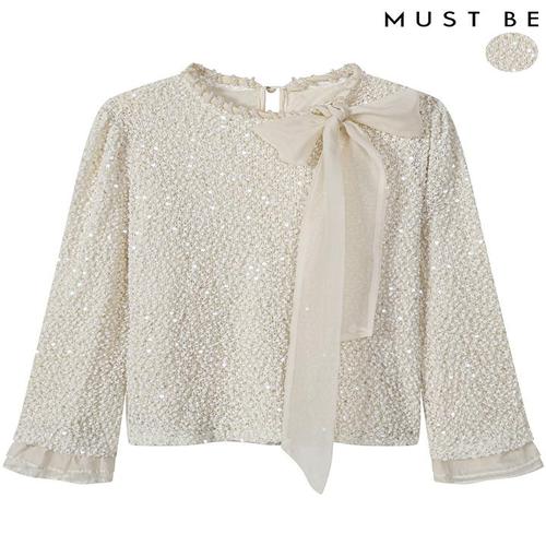 [머스트비]여성 리본타이 진주 스팽글 블라우스