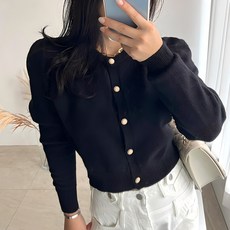 네모엔룩 캔디퍼프숄더 여성용 도톰 긴팔 라운드넥 골드버튼 세미 크롭 니트 가디건