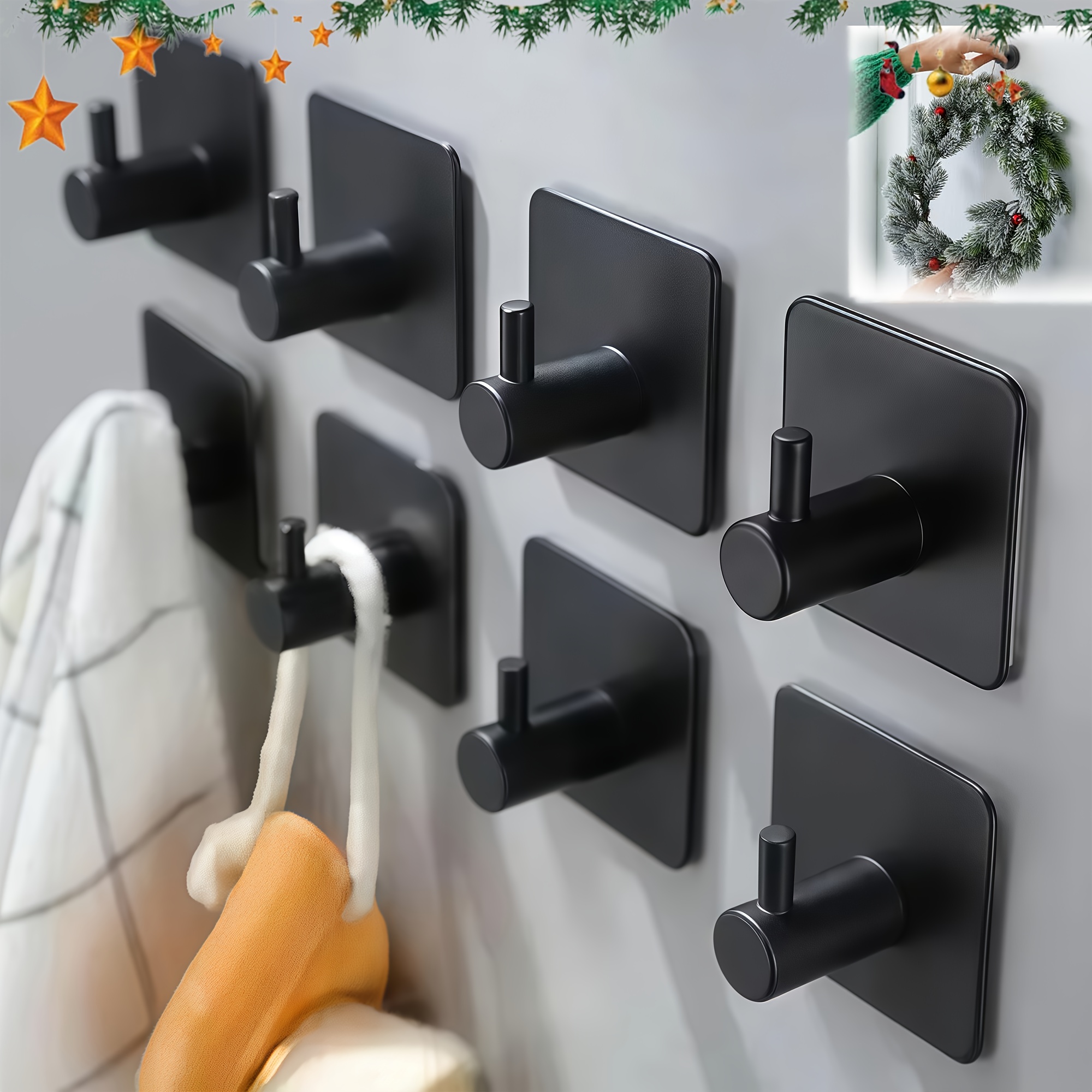 TEMU 8개입 고강도 방수 304 스테인리스 스틸 접착식 후크 - 드릴 필요 없는 자가 접착 벽걸이, 욕실, 주방, 샤워실용 - 타월, 코트, 가방, 모자 강력 고정 - 매트 블랙 접착식 후크 (드릴 필요 없음)|샤워타올