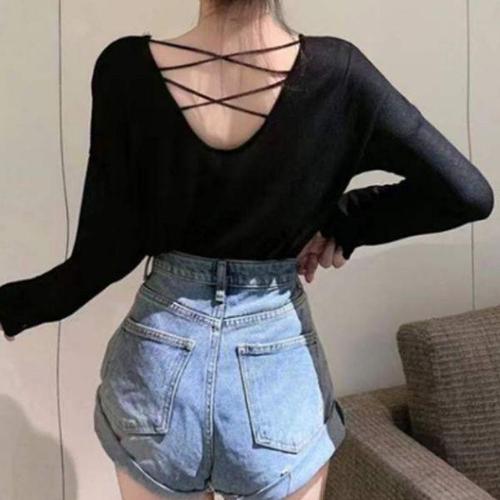[에이치플러스몰]여성 백스트랩 시스루 티셔츠 1P 간절기 슬림핏 긴팔