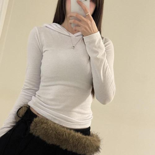 [옷자락] 여자 슬림핏 시스루 크롭 스판 레이어드티 후드 티셔츠