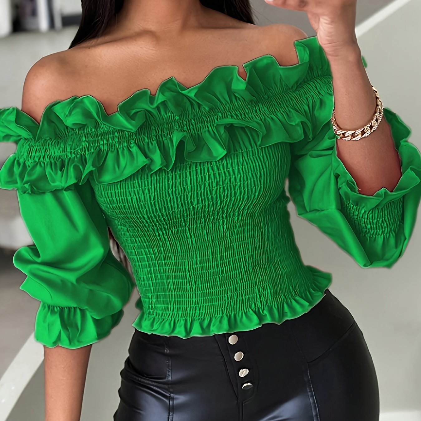 TEMU 여성용 우아한 그린 단색 탑, 러플 오프숄더 및 퍼프 소매, 현지 재고 제품.