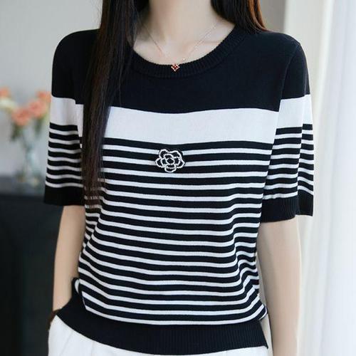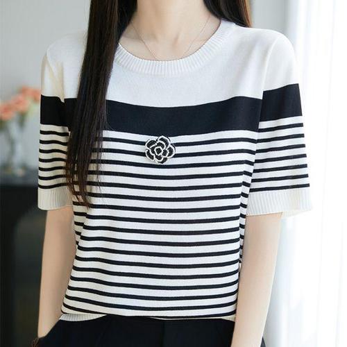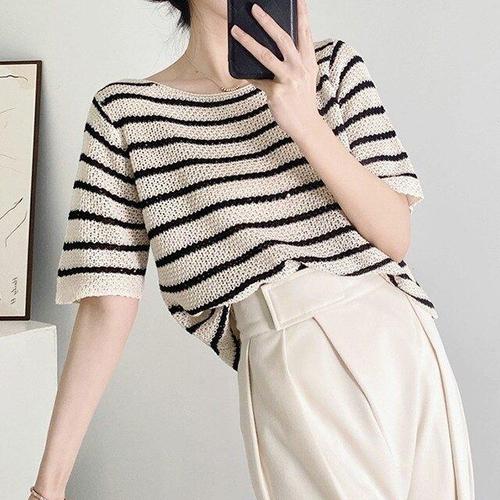 [핑크엘리제]스트라이프 여름 실크 반팔 니트티 호루아니트티