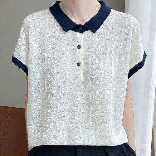 [핑크엘리제]배색 카라넥 자수 실크 반팔 니트티 아일린니트티