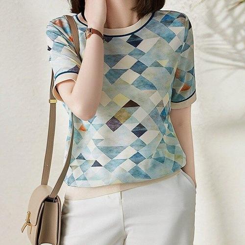 [핑크엘리제]라운드넥 프린트 실크 반팔 티셔츠 라일디반팔티