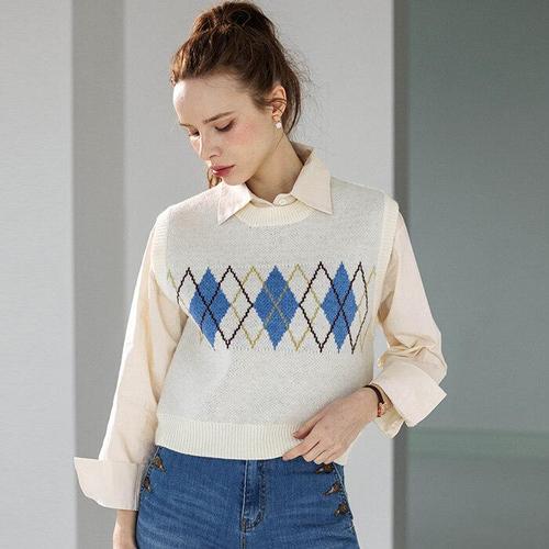 [스타일온미]아가일 라운드 니트베스트&베이직 셔츠 set