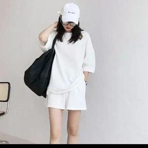 [문에이블]문에이블 트레이닝복 프리사이즈 허리밴딩 시보리 프린팅 여자 반팔티 반바지 코디세트