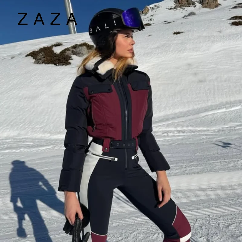 방수 여성용 스노보드 점프수트 패치워크 퍼 칼라 배색 지퍼 일체형 스키복 벨트 포함 2026 신상 여성 스키웨어