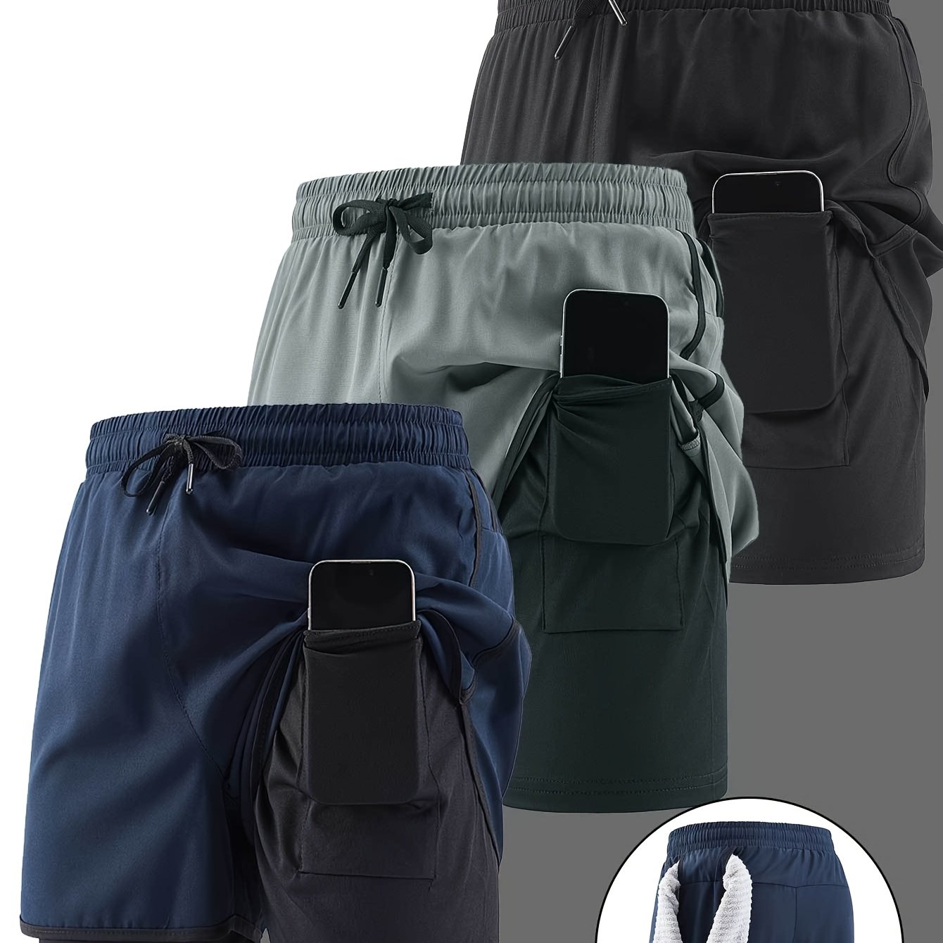 TEMU 남성용 캐주얼 단색 스타일리시 프린트 투인원 트레이닝 스포츠 퀵 드라이 드로스트링 반바지 3종 세트