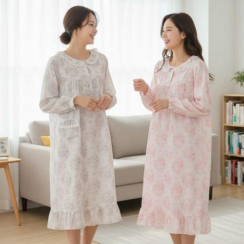 [보슈아]1327 여성 긴팔 원피스 아사면 파자마 홈웨어 뜨왈패턴 국내산