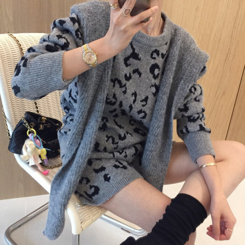 아이미마인 / 투스 라운드 긴팔니트 밴딩 반바지 레오파드 니트 투피스세트 (2color)