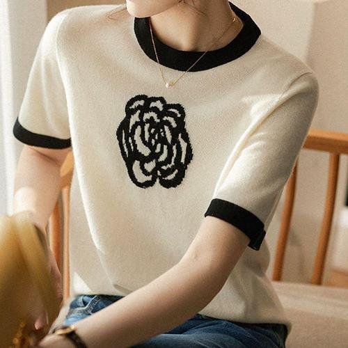 [셀럽하우스]여성 INIG2855 여름 플라워 배색 라운드 반팔 니트 티 아이보리