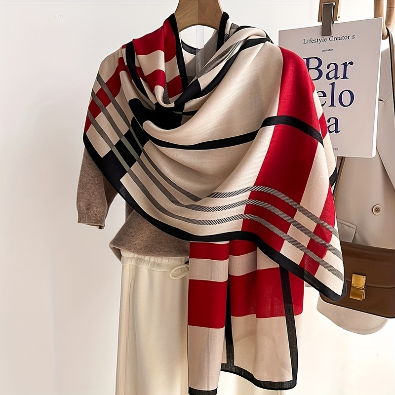 TEMU 여성용 기하학 프린트 가벼운 스카프 - 블랙/화이트/그레이/베이지 멀티컬러, 방풍 및 보온 기능, 다목적 비치 숄, 넥 랩, 헤드스카프 - 캐주얼 아웃도어 여행 액세서리, 세련된 캐주얼 웨어