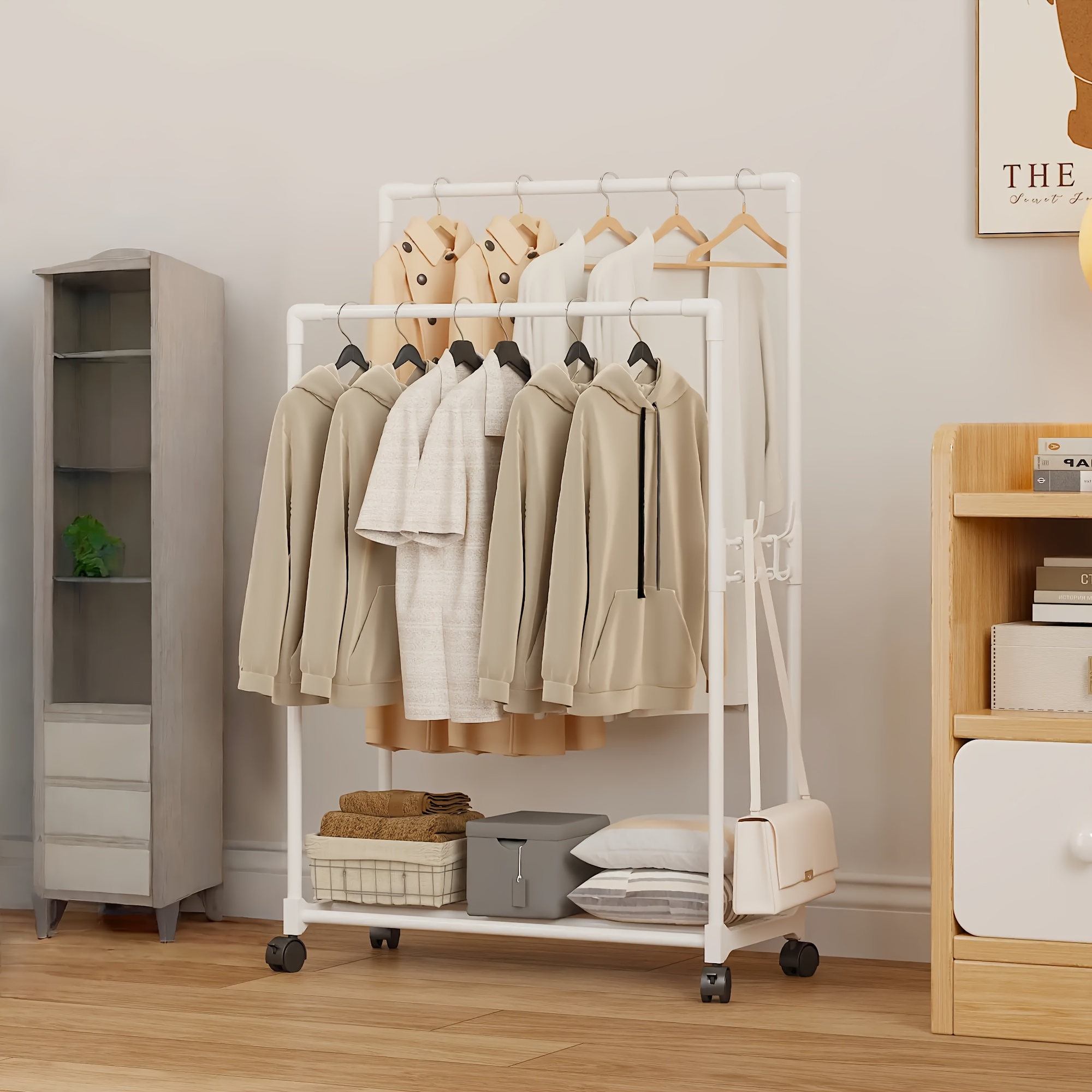TEMU 휠이 달린 견고한 스탠딩 빨래건조대 - 튼튼한 금속 빨래 보관대, 공간절약형 홈 옷걸이, 기숙사 및 아파트용 - 이동식 빨래바구니와 연결 가능|빨래건조대|빨래바구니
