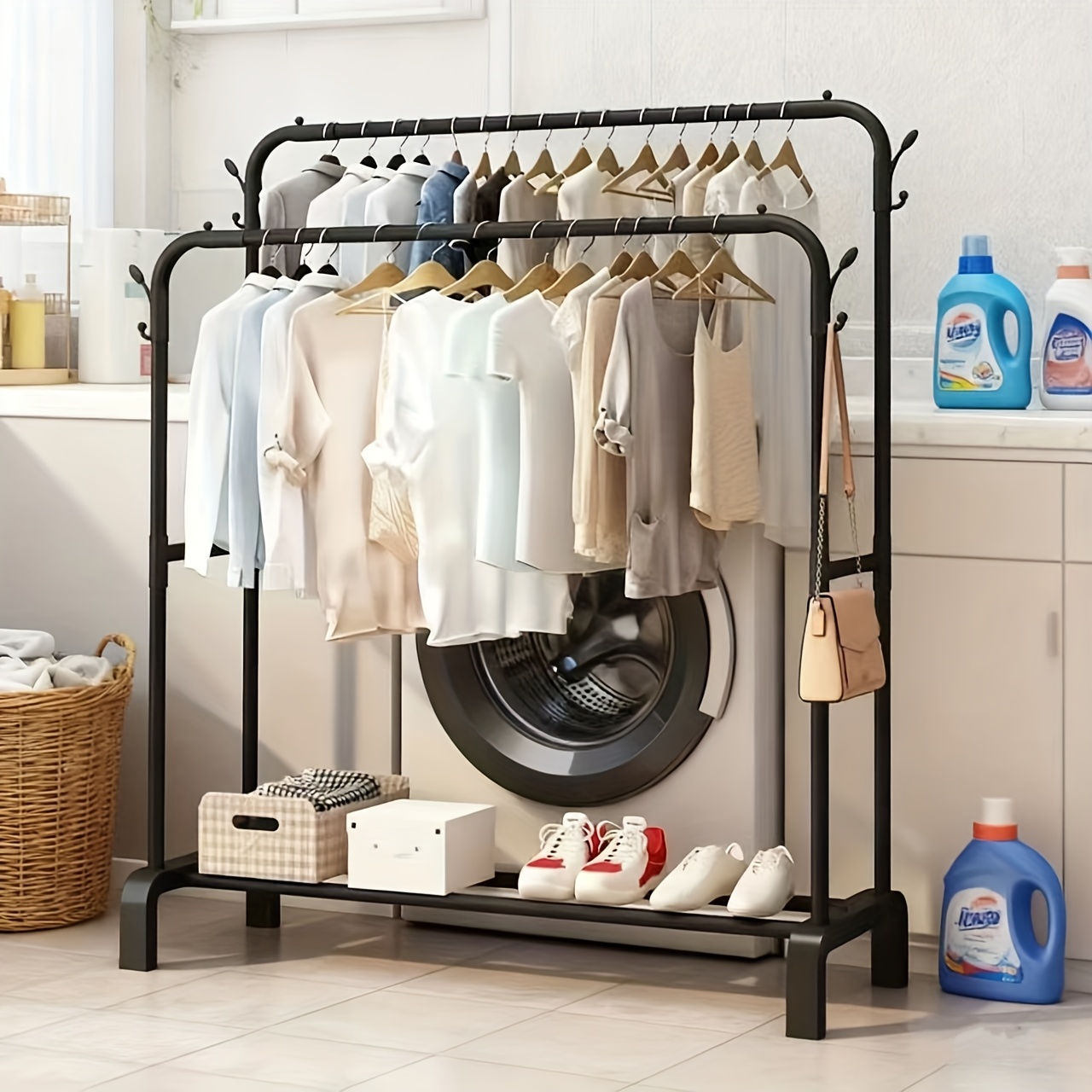 TEMU 1개 튼튼한 독립형 옷 건조대 2단 디자인 - 튼튼한 철제 프레임 & 플라스틱 후크, 공간 절약형 세탁 건조대 (옷, 침실, 욕실용) - 간편한 조립, 블랙, 옷 건조대, 옷 건조대|빨래건조대