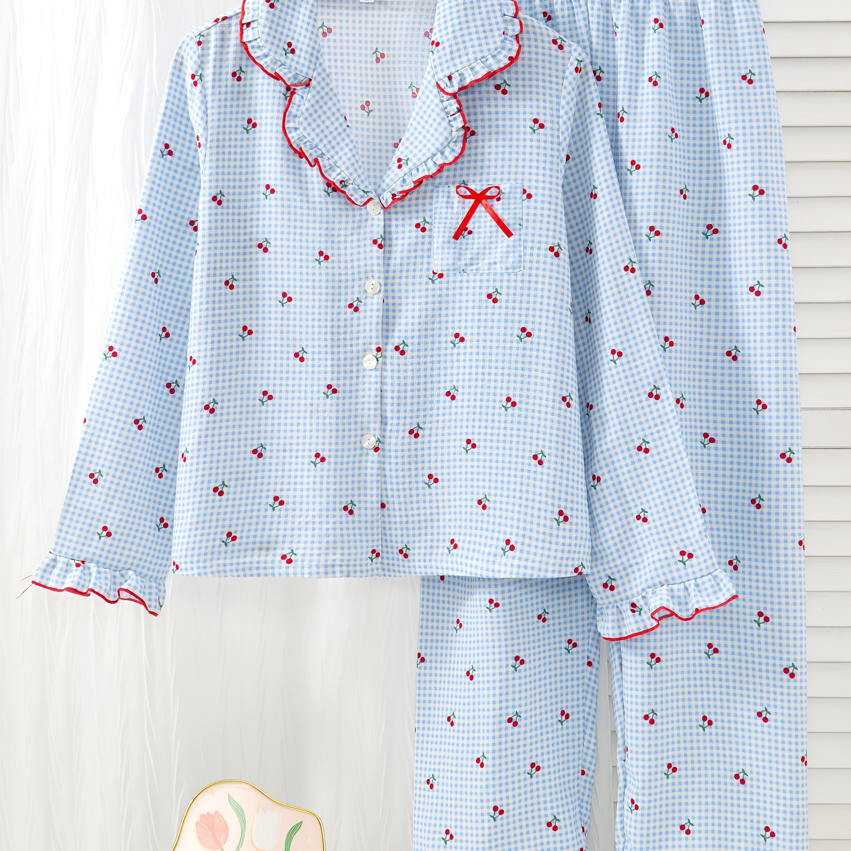 TEMU 2pcs 블루 깅엄 체리 프린트 파자마 세트, 러플 긴소매 상의 및 바지 의상, 간편하고 편안한 레드 트림 홈웨어 (가디건 라펠 버튼 플리츠 러플 리본)|여름잠옷