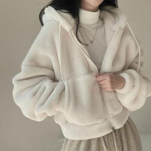 [옷자락]여성 세미크롭 양모 후드 집업 데일리 뽀글 자켓