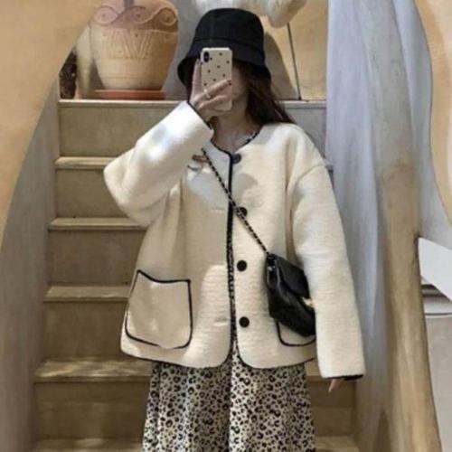 여성 캐주얼 배색 노카라 뽀글이 양털 루즈핏 가디건