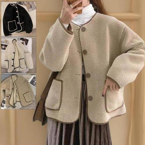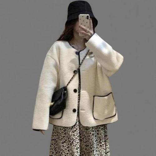 [신상오픈런]여성 루즈핏 양털 가디건 배색 노카라 캐주얼 디자인