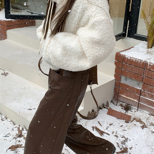 [시크블랙]라비드 뽀글 양털 안감 세미 크롭 레더 자켓