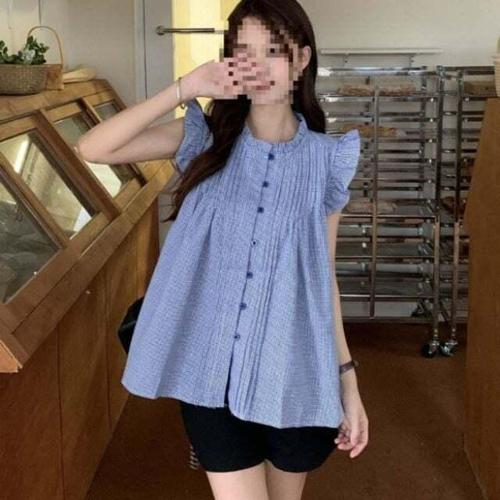 [셀럽하우스]민소매 GCDV1946 라운드 단추 여름 플레어핏 어깨프릴 캐주얼