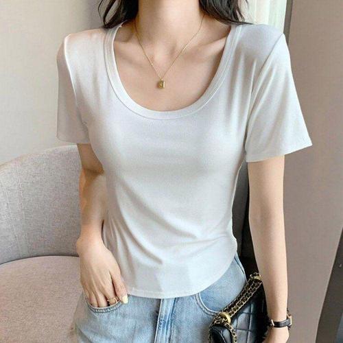 [굿쇼핑몰_의류]여자 가벼운 소재 U넥 디자인 언발란스 반팔 티셔츠