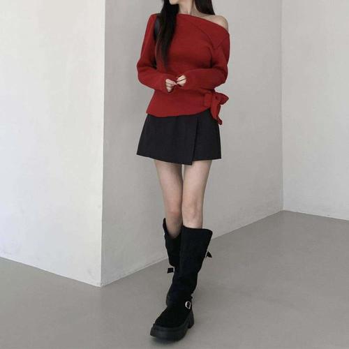 [미라클세븐]여성 울혼합 언발란스 리본 스트랩 원오프숄더 니트
