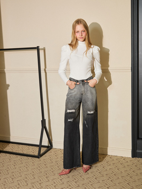[에고이스트] ER1DP261 자수 포인트 언발 슬릿 와이드 데님 팬츠 (25년 봄)