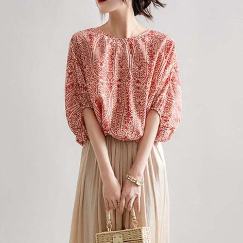레트로 에스닉 랜턴 슬리브 셔츠 여성용 루즈핏 얇은 태슬 자수 디자인 여름 상의 한국 스타일 긴팔