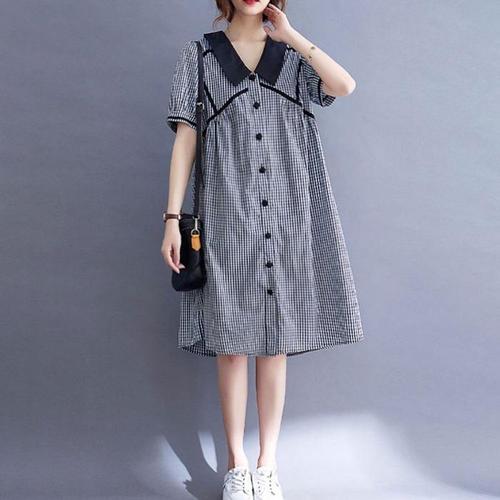 [셀러허브_여성트랜드패션]여름 간절기 블랙 카라 잔체크 미디 원피스