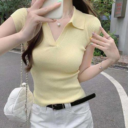 [다잇템_패션]여자 슬릿 멀티컬러 골지 반소매 슬림핏 니트