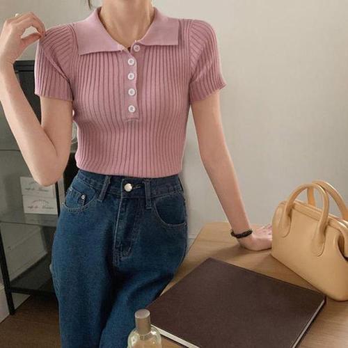 [다잇템_패션]여자 골지 반소매 단추 슬림핏 멀티컬러 니트