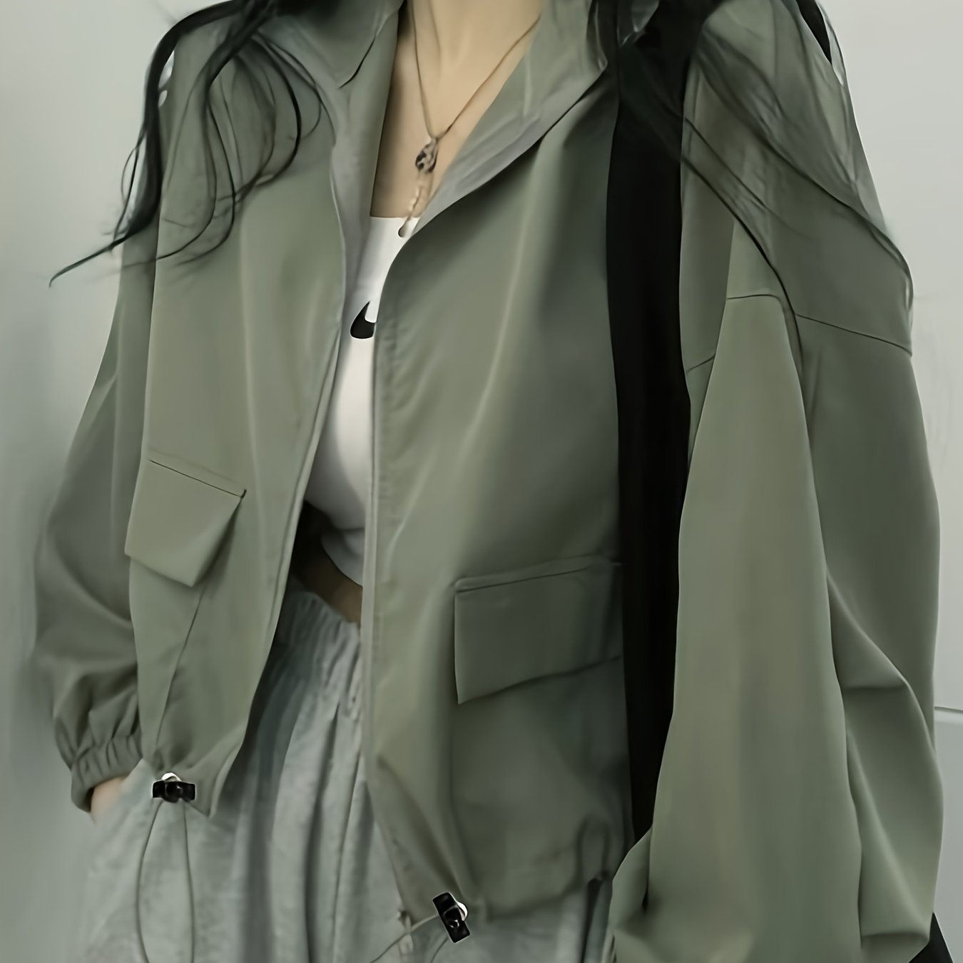 TEMU 플러스 사이즈 캐주얼 트렌치 코트, 여성용 플러스 솔리드 긴 소매 지퍼 업 후드 드로우 스트링 윈드 브레이커 코트 (포켓 포함)