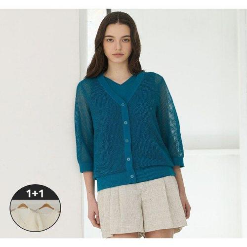 [엘루아][엘루아] 썸머 코튼 블렌딩 크로쉐 가디건+니트탑 블라우스 세트_틸블루