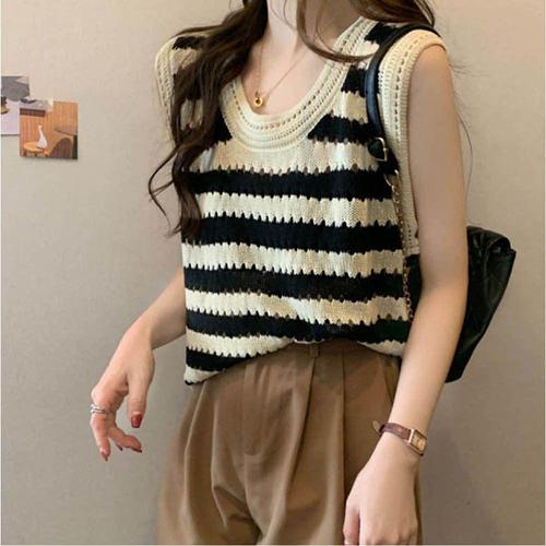 소디말수 여성 캡 슬리브 탱크 탑 스트라이프 크루넥 캐주얼 루즈핏 봄 여름 풀오버 니트 스웨터 조끼