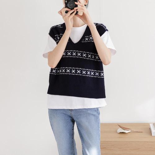 [옷자락]여자 봄 여름 패턴 배색 니트 베스트 브이넥 조끼_4