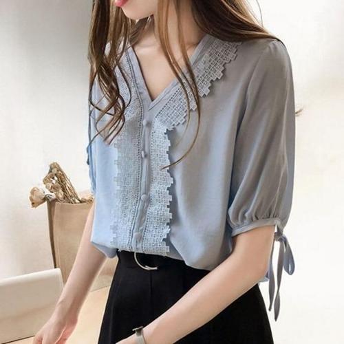 [엄지척]봄 여름 가을 브이넥 레이스 데일리 반팔 블라우스_19643915_667501