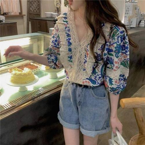 WL S4862 휴양지 여름 레이스 패턴 블라우스 셔츠 남방 WFLQROT