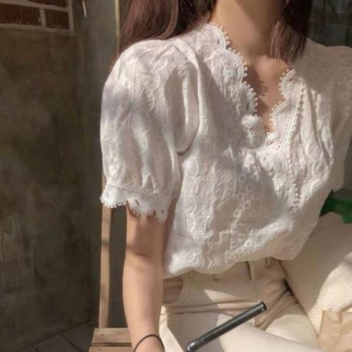 [엄지척]여성 여름 반팔 물결 레이스 얇은 블라우스 퍼프소매_19650379_667501