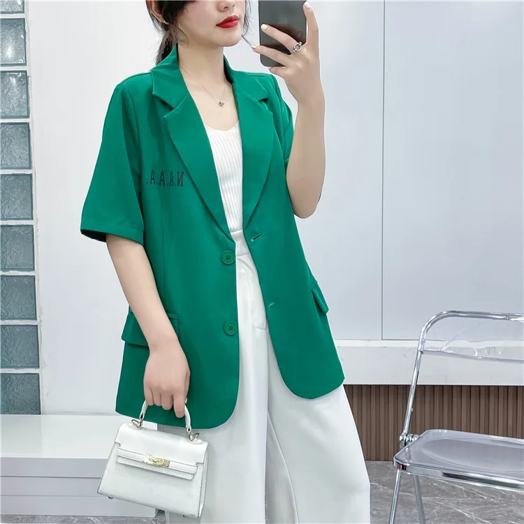 루즈 캐주얼 단색 레터 패턴 반팔 수트 재킷 여성 봄 여름 패션 심플 드레이프 탑