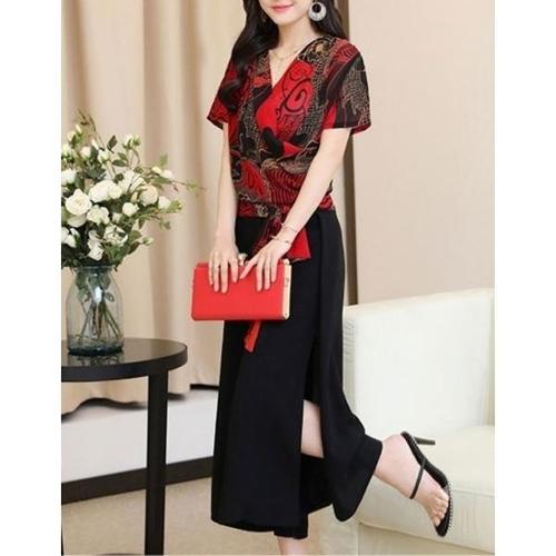 [엄지척]여름 쉬폰 반팔 블라우스 옆트임 7부 치마 바지 세트_19556434_667501