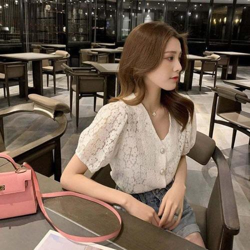 [셀럽하우스]자수 LAMZ5765 블라우스 벌룬 퍼프 소매 반팔 브이넥 여름 코디