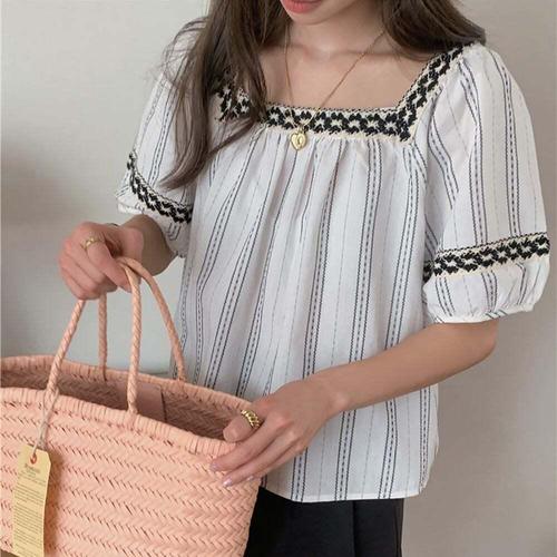 [셀럽하우스]여성 HTAO5645 여름 심플 스퀘어넥 반팔 자수 화이트 블라우스