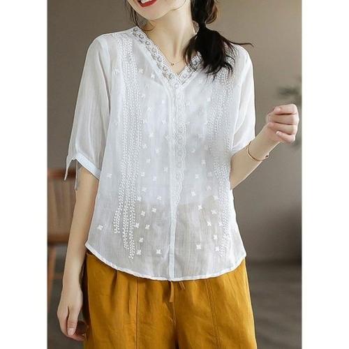 [엄지척]여성 여름 루즈핏 라운드 플라워 자수 5부 블라우스_19650434_667501