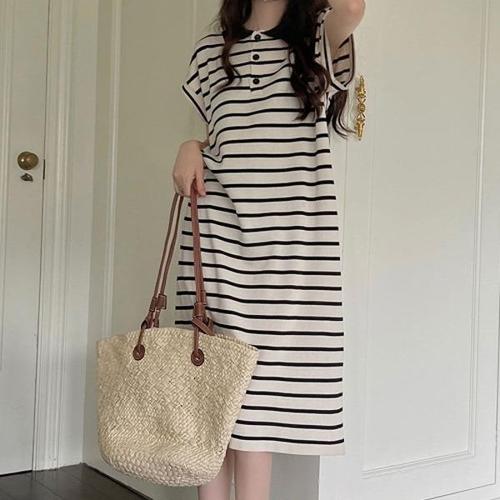 스트라이프 롱원피스 루즈핏 밑단절개 여름 홈웨어 WEE9271