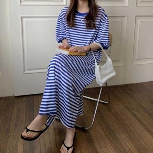 쉬폰원피스 여성 스트라이프 여름 니트 스퀘어넥 반팔 롱 원피스