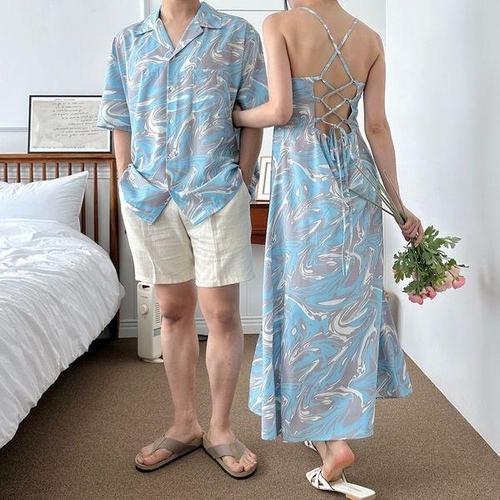[에이치플러스몰]남녀 블루 커플룩 바다웨어 여름 셔츠남방 롱원피스