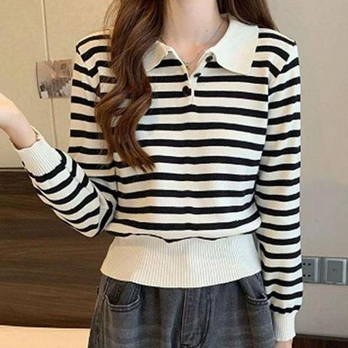 [라일리여성의류] Rly 여성 데일리 배색 카라 단가라 긴팔 니트티