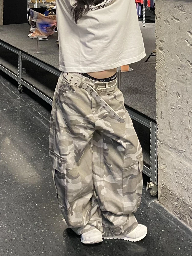 레트로 아메리칸 화이트 그레이 카모플라주 나이프 엣지 진 여성용 가을 루즈 슬림 와이드 레그 워크웨어 팬츠 하이웨이스트 데님